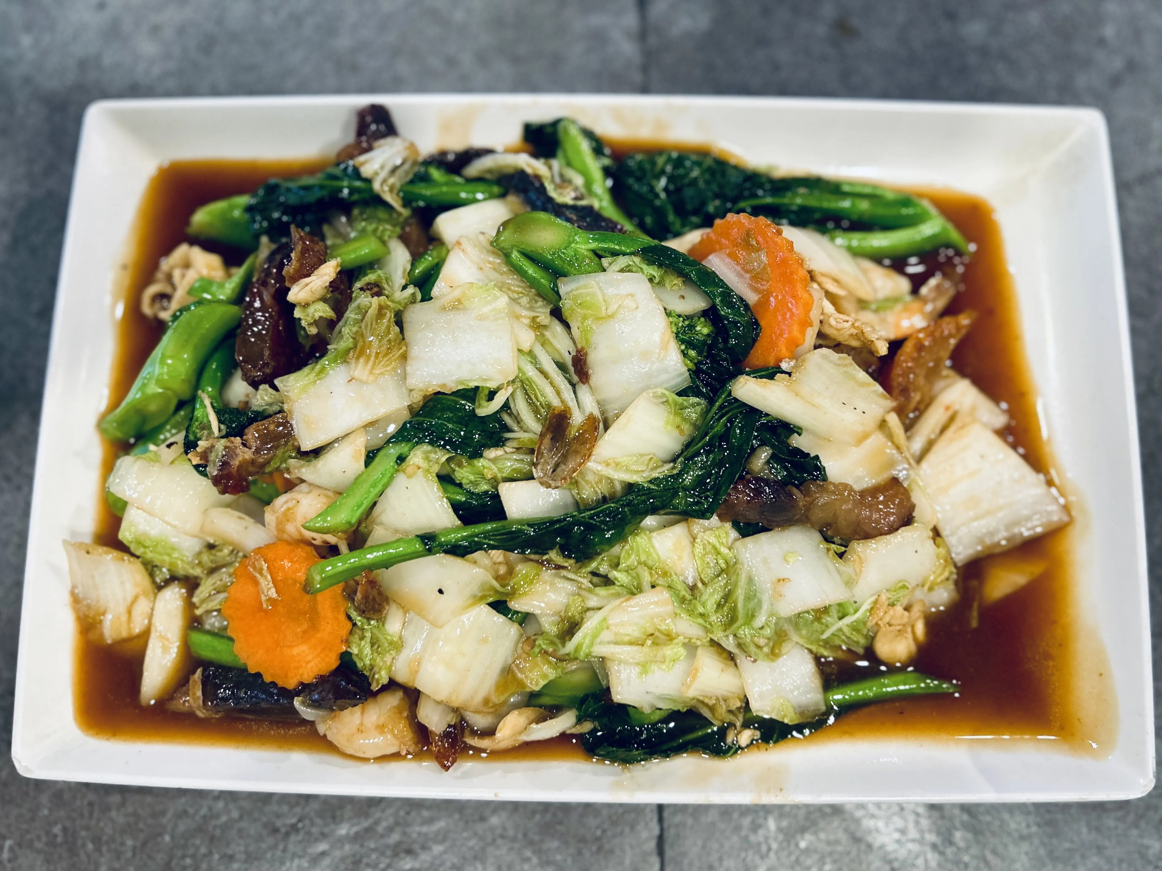Combination Meat Stir Fried With Fresh Cabbage, Carrots & Chinese Broccoli.