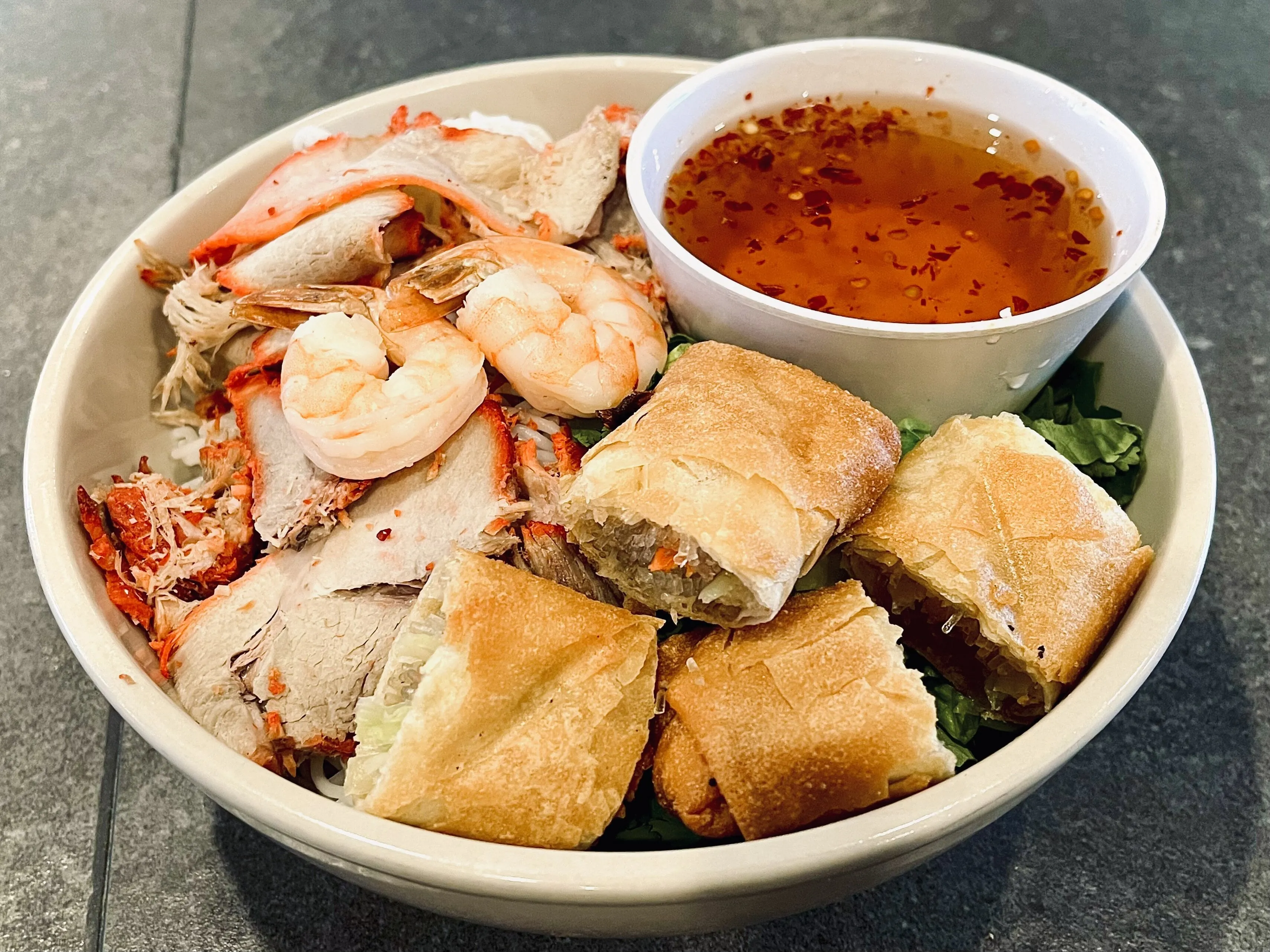 Sliced Pork, Egg Rolls & Veggies Served With Rice Noodles In A Sweet Sauce.