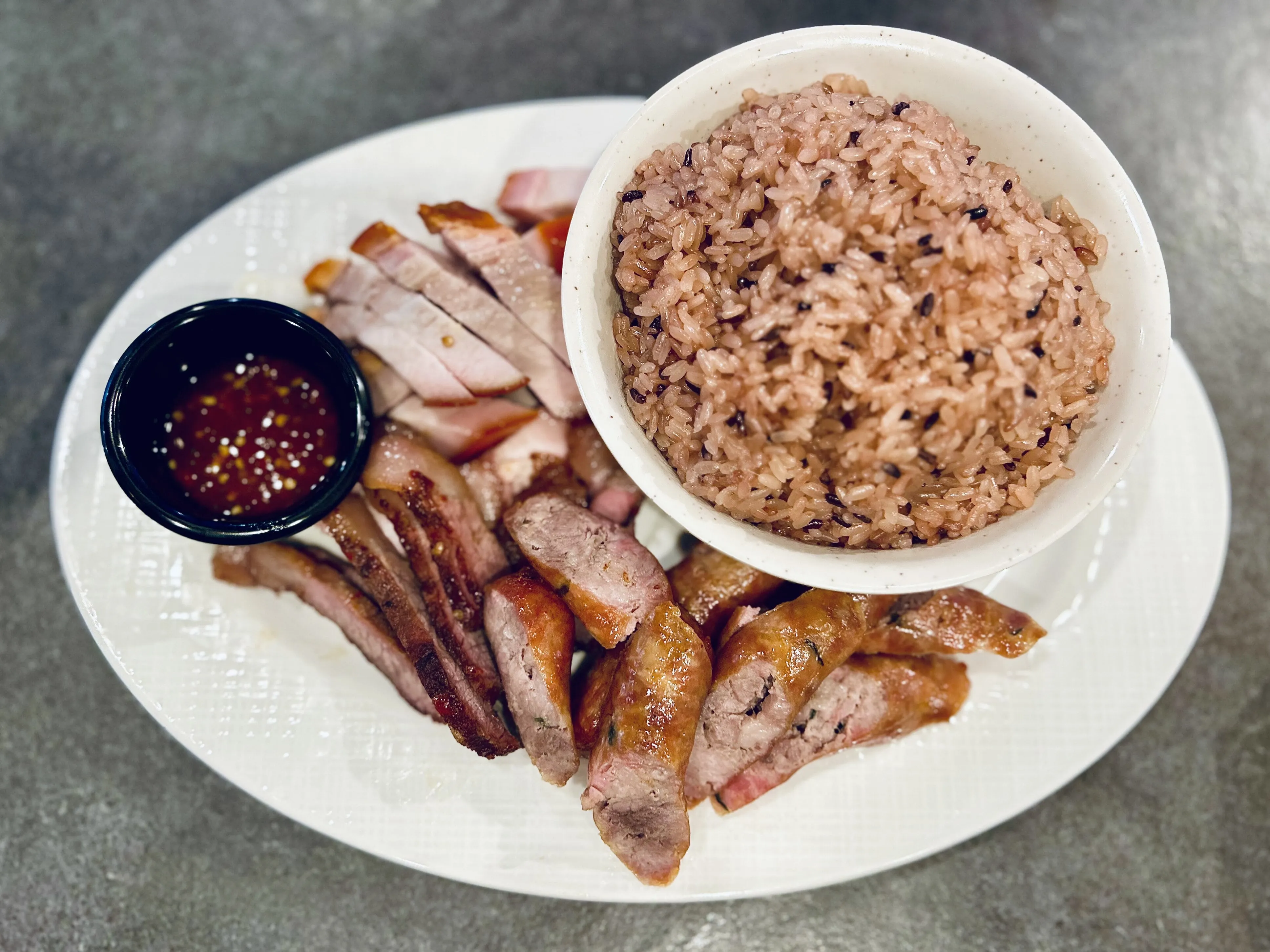 Rice With Sausage, BBQ Pork Belly & BBQ Beef Brisket.