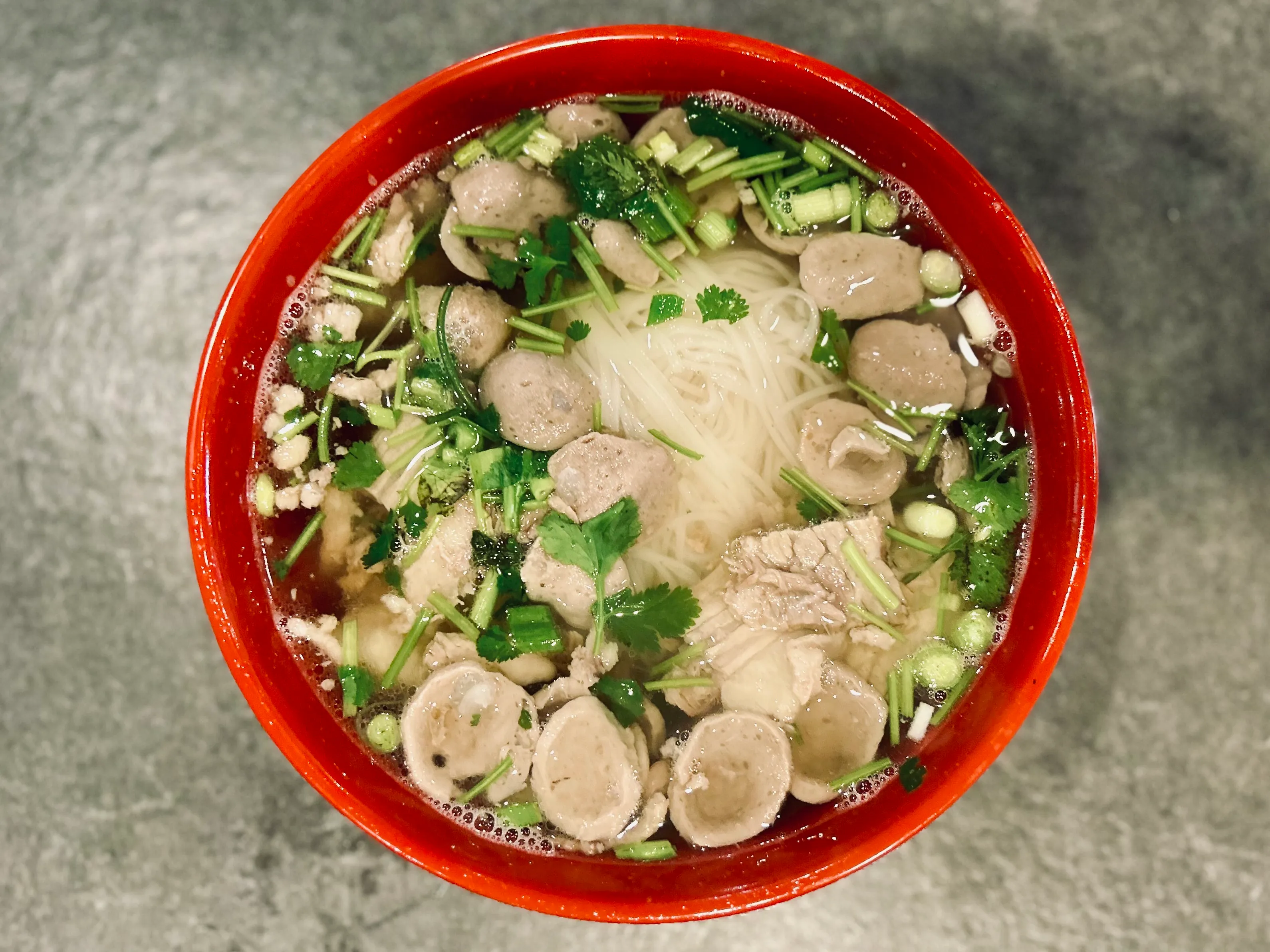 Meatballs, Beef & Tendon Served Over Rice Noodles In A Savory Broth.